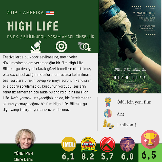 Festivallerde bu kadar sevilmesine, methiyeler düzülmesine anlam veremediğim bir film High Life. Bilimkurgu deneyimi olarak güzel temellere oturtulmuş olsa da, cinsel açlığın metaforunun fazlaca kullanılması, bazı sorulara bırakın cevap vermeyi, sorunun kendisinin bile doğru sorulamadığı, kurgunun yorduğu, seslerin rahatsız etmekten öte mide bulandırdığı bir film High Life. Kafa yormak isteyeceğiniz halde, hiç üstelemeden aklınızı yormayacağınız bir film High Life. Bilimkurgu diye yanıp tutuşmuyorsanız uzak durunuz.